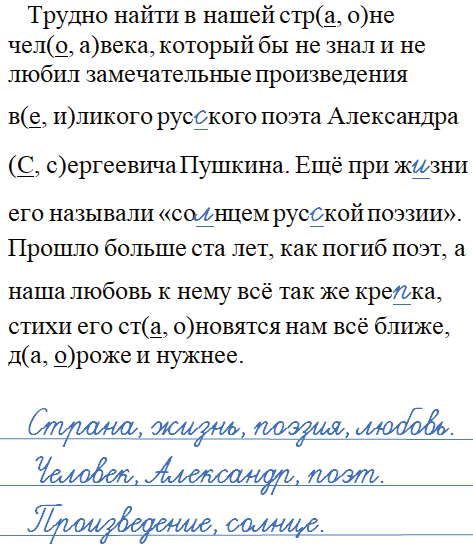Трудно найти в нашей стр(а, о)не чел(о, а)века, который бы не знал и не любил замечательные произведения в(е, и)ликого рус..кого поэта Александра (С, с)ергеевича Пушкина. Ещё при ж..зни его называли «со..нцем рус..кой поэзии». Прошло больше ста лет, как погиб поэт, а наша любовь к нему всё так же кре..ка, стихи его ст(а, о)новятся нам всё ближе, д(а, о)роже и нужнее.