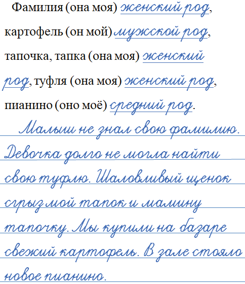 Фамилия (она моя) ________, картофель (он мой) _______, тапочка, тапка (она моя) ________, туфля (она моя) _______, пианино (оно моё) _______.