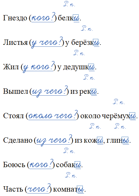 Не боюсь (кого?) змеи. Гнездо (_____) белк.. . Листья (_____) у берёзк.. . Жил (_____) у дедушк.. . Вышел (_____) из рек.. . Стоял (_____) около черёмух.. . Сделано (_____) из кож.., глин.. . Боюсь (_____) собак.. . Часть (_____) комнат.. .