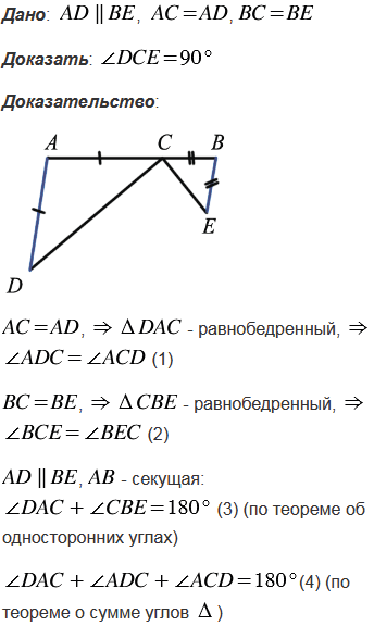 BE, AC = AD и BC = BE. Докажите, что угол DCE - прямой.