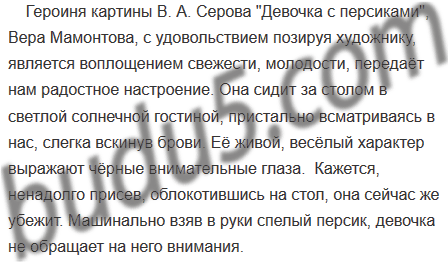 Продолжим работу с картиной В. А. Серова «Девочка с персиками». Ощущение свежести, молодости, радостно-спокойного настроения создаётся прежде всего, когда мы рассматриваем девочку. Попробуйте описать лицо, позу, мимику, жесты девочки. Для описания используйте наиболее подходящие деепричастные обороты, употребив их в качестве обособленных обстоятельств.