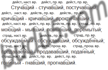 Подберите к причастиям настоящего времени однокоренные причастия прошедшего времени. Запишите и обозначьте суффиксы причастий. У каждого причастия укажите его разряд (действительное или страдательное) и вид (совершенный или несовершенный).
