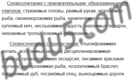 Стриже..ые головы, рва..ый рукав, отшлифова..ая деталь, дисциплинирова..ая ученица, организова..ая экскурсия, испуга..ый малыш, писа..ая красками картина, мороже..ая рыба, замороже..ая рыба, свежемороже..ая рыба, некипячё..ое молоко, позолоче..ый браслет, купле..ый мяч, посаже..ый дуб, посажё..ый отец, вымоще..ые дороги, неслыха..ая радость, жела..ый подарок, нехоже..ые тропы, хоже..ый-перехоже..ый.