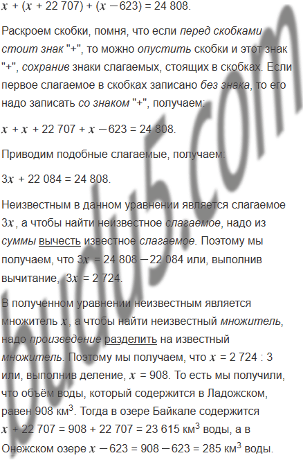 Тремя крупнейшими озёрами России являются озеро Байкал, Ладожское озеро и Онежское озеро. Общий объём воды, содержащийся в этих озёрах, составляет 24 808 км3, причём объём воды, содержащейся в Ладожском озере, на 22 707 км3 меньше, чем объём воды озера Байкал, и на 623 км3 больше, чем объём воды Онежского озера. Сколько кубических километров воды содержится в каждом из этих озёр?