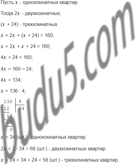 В доме 160 квартир трёх видов: однокомнатные, двухкомнатные и трёхкомнатные. Однокомнатных квартир в 2 раза меньше, чем двухкомнатных, и на 24 меньше, чем трёхкомнатных. Сколько в дома квартир каждого вида?