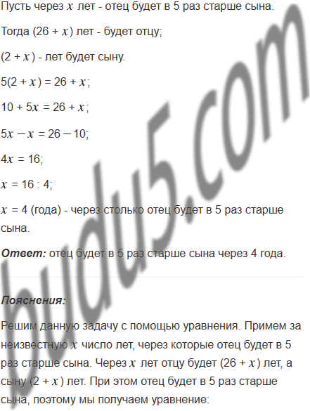 Сейчас отцу 26 лет, а его сыну - 2 года. Через сколько лет отец будет в 5 раз старше сына?