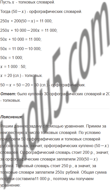Для школьной библиотеки приобрели 50 орфографических и толковых словарей русского языка на общую сумму 11 000 р. Сколько было куплено словарей каждого вида, если орфографический словарь стоит 200 р., а толковый - 250 р.?