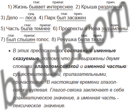 1) Жизнь бывает интереснее самых волшебных сказок. 2) Крыша разделена перегородками. 3) Чудесное дело — леса! 4) Парк был засажен растениями из разных стран. 5) Восточная часть неба была темнее западной. 6) Проспекты и Нева задымлены слабым туманом. 7) Всё реже был слышен голос незнакомки. 8) Речушка была тихая.