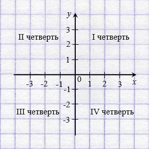 Координатные оси разбивают плоскость на четыре части, которые называют координатными четвертями и нумеруют так, как показано на рисунке ниже.