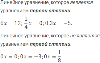 Приведите пример линейного уравнения, являющегося уравнением первой степени, и пример линейного уравнения, которое не является уравнением первой степени.