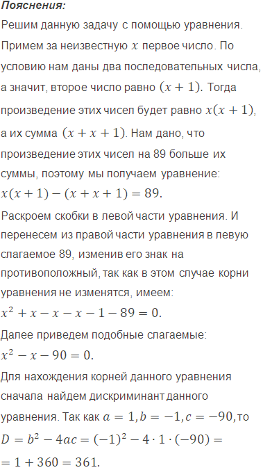 Произведение двух последовательных натуральных чисел на 89 больше их суммы. Найдите эти числа.