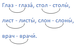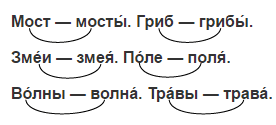 Мост — мосты́. Гриб — грибы́. Зме́и — змея́. По́ле — поля́. Во́лны — волна́. Тра́вы — трава́.