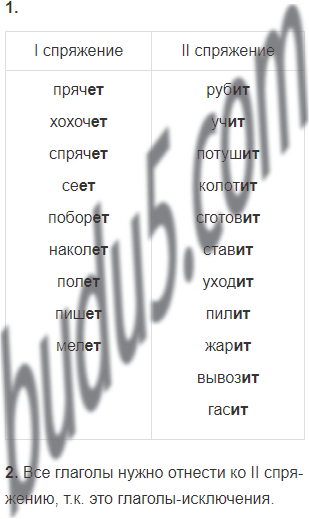 ! Обрати внимание, что если глагол-исключение употребляется с приставкой, то спряжение у него будет таким же, как у глагола без приставки (доганть - гнать - II спр.).